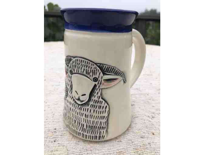 Large mug, 5.5" tall, with an adorable pair of sheep. Hand made by Occidental potter Cindy Searles. Leaf detail at base of handle.