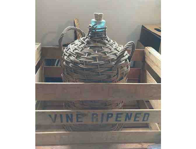Rustic, woven rattan-wrapped Blue Vintage Wine Bottle with two woven handles rests in a Vintage Crate. Great for creating atmosphere at your country or city home, or at your winery.