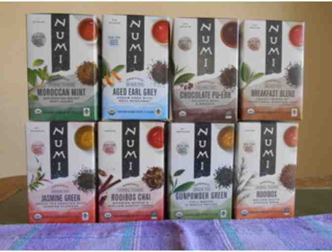 Sampling of Numi Teas, 8 boxes, 18 tea bags per box. 1 box each of Moroccan Mint, Aged Earl Grey, Jasmine Green, Rooibos, Breakfast Blend, Chocolate Pu-erh, Rooibos Chai, and Gunpowder Green.