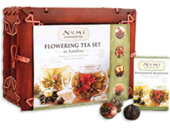 Flowering Tea™ is the most innovative art form in loose leaf tea. Organic tea leaves are handsewn around flowers, these rare Leaves of Art™ slowly blossom into a bouquet of breathtaking shapes and exquisite flavors. This handcrafted mahogany bamboo chest contains a small box of 6 Flowering Teas™ and a glass teapot.