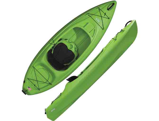 Made in the U.S.A, this sit-in, one person recreational kayak offers front and rear carry handles; action camera mounts; a cup holder; a foam seat with adjustable back rest; a paddle keeper; and a drain plug. This is a great boat for the beginner kayaker.  Kayak is new, never used. Paddle not included.