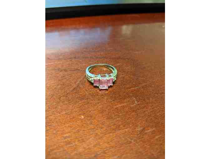 Three Stone Pink Topaz Ring, White Gold Band, Size 7