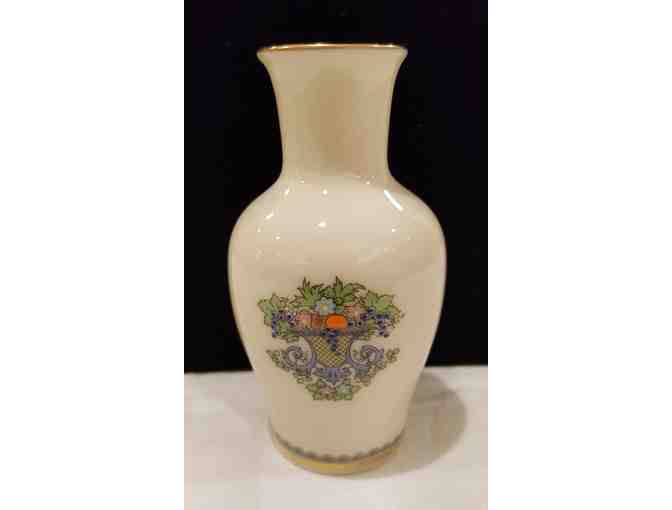 Hand decorated with 24K gold trim, the bright colors and elaborate design of the vase reflects the continued popularity of this classic pattern by Lenox China.  The fruit and floral design is accented with raised enamel elements.  The base color of the vase is a rich cream.