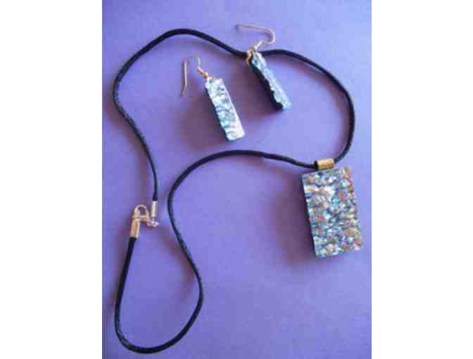 Handmade purple and aqua colored iridescent glass with hints of pink and silver pendant and earrings by Libby Kirk. Dazzling colors change with the light.