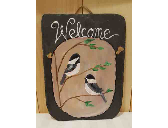 Handpainted slate features two friendly chickadees to welcome guests to your home. The slate is over 100 years old and comes from the roof of a home in Concord, MA. It is weather proofed and ready to hang inside or out. Created by local artist Johanna Reagan.