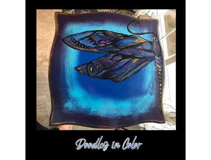 Vintage table redesigned. The table is 21.5x21.5 and 26 inches tall. The entire piece is hand painted and is inspired from a dragonfly hovering over a rustic bucket pond and its contrast to the metallic majesty of the dragonfly hovering over it as I was lucky enough to catch a glimpse.