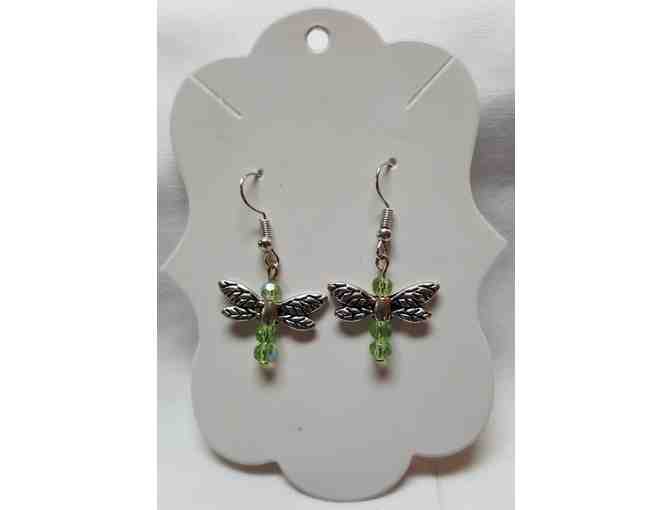This pair of shimmering green dragonfly earrings was handcrafted by Amy Clement for NRWA's auction. These earrings are made of faceted glass beads with metal bead wings, as well as surgical steel posts. Simple, fun!