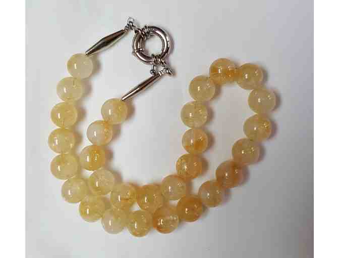 Each bead is unique in this string of 14mm natural yellow and white quartz beads.  Patterns and shades of creamy white to clear to yellow and gold vary from bead to bead.  18" necklace has solid and secure metal clasp.