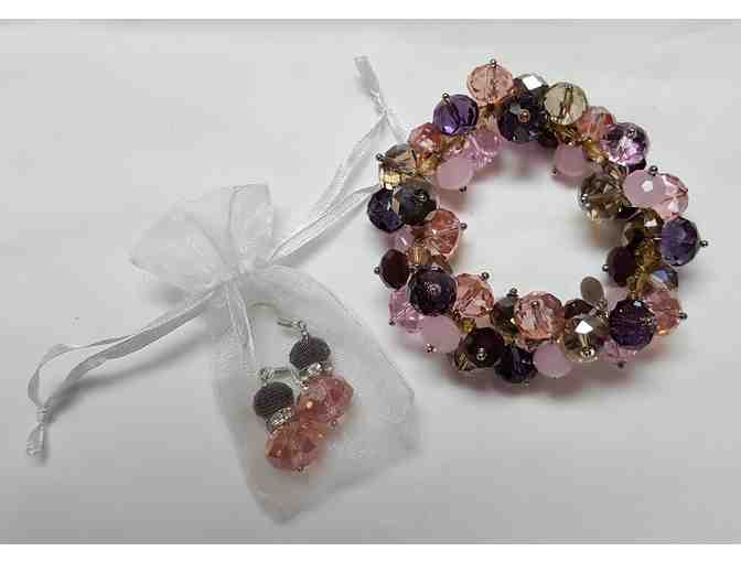 Delightful! Sparkling faceted quartz glass beads in shades of pink, clear, and purple make up this cheery bracelet and earring set. Bracelet is built on an elasticized band to fit any wrist size. A bit of color and dazzle to brighten your day.