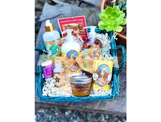 Wellness Basket is filled with local, luxurious bath and body products From Dolce Mia plus some healthy sweetness! 8 oz pump hand sani, 12 oz pump liquid soap, 12 oz. pump lotion, 6 oz. soap bar and 2 oz travel hand sani + botanical/herb infused “Chill” honey.