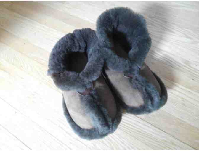 Keep your feet warm and cozy in these handmade sheepskin slippers made by Wind Walkers. Chocolate color. Choice of size.