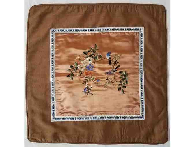 The winning bidder will receive a charming, brown embroidered fabric pillow form from Beijing China. Zipper on the side. Pillow not included. Dimensions: 15 3/4" x 15 3/4".