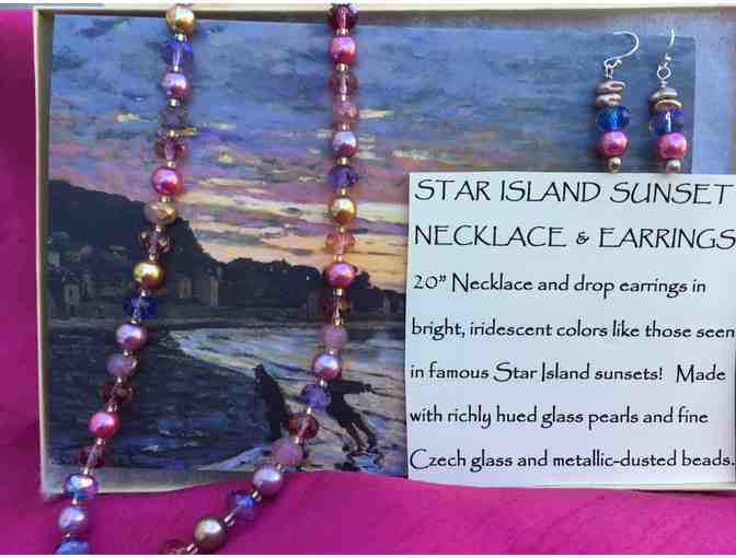 20" necklace and drop earrings in bright, iridescent colors like those seen in famous Star Island sunsets! Made with richly hued glass pearls and fine Czech glass with metallic dusted beads.