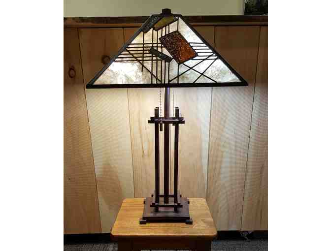 Here is a statement piece for lighting. The base of the lamp is in the mission style and the shade mixes metalwork and stained glass. This is a Quoizel lamp, a maker of Tiffany reproductions and stained glass lamps in many styles.