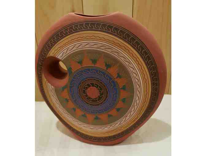 Hand painted and etched pottery piece is signed by Johnny W. Navajo. The red clay is embellished with a geometric bear motif on one side and a sun symbol design on the reverse. This pottery is in perfect condition and exquisite in color and design.