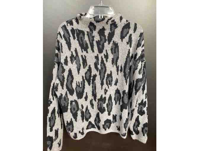 From our upscale resale shop, Fantastic Finds. Grey and black leopard print Neiman Marcus cashmere mock neck sweater, women’s size small.
