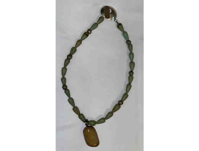 From our upscale resale shop, Fantastic Finds. Handmade one of a kind necklace made by Indigo Rhino made with teardrop turquoise and amber gemstone.