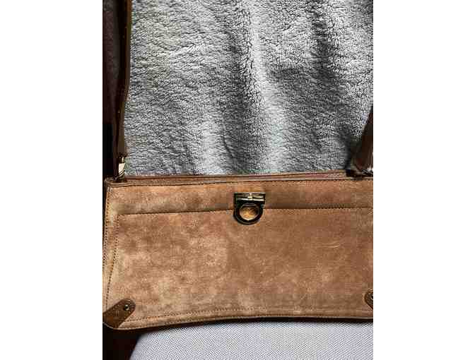 From our upscale resale shop, Fantastic Finds. Genuine Salvatore Ferragamo crossbody tan bag suede with leather trim.