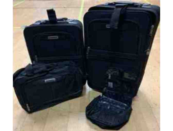 This four piece set includes a carry-on suitcase, small children's size suitcase, duffel and toiletries bag