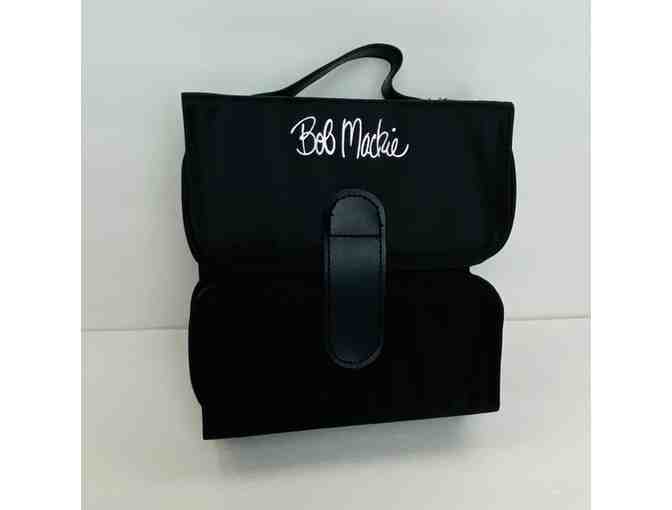 Opens to reveal two zippered/removable pockets and a flip-up mirror; folds small enough to fit in a briefcase or handbag.