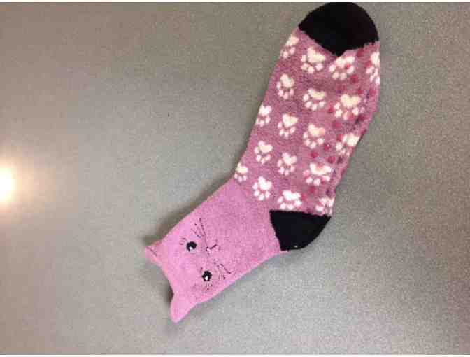 Perky ears and adorable whiskered smiles, these super soft socks are a sweet treat for your feet! Patterned with white paw prints and completed with grips along the soles for non-slip comfort.
