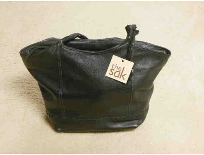 Black leather shoulder bag. About 16-1/2" wide x 10-1/2" tall.