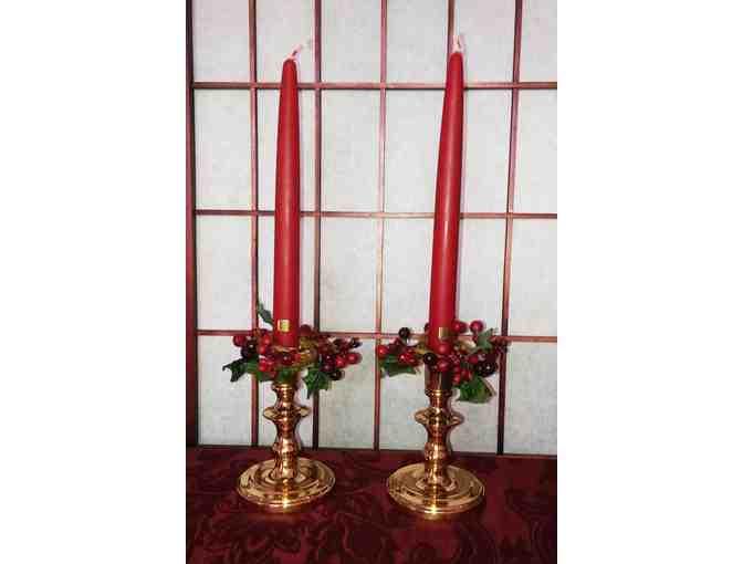 These are high quality brass candle holders, nice and heavy. Candles and mini-wreaths included.