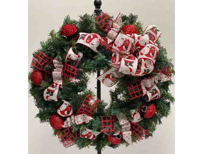 Santa Claus is Coming to Town! 22" Faux Evergreen wreath, decorated with Santa belly Christmas ornaments, Traditional Santa ribbon and a large bow!