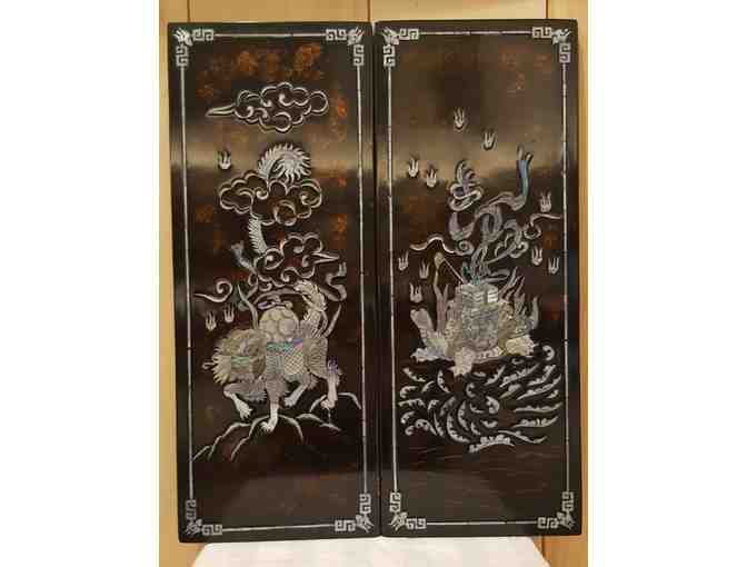 Pictured on these laquered plaques with mother of pearl insets are the Tortoise and the Unicorn. The Vietnamese Unicorn seems half dragon and half mammal. This beast may be depicted with one, two, or no horns.