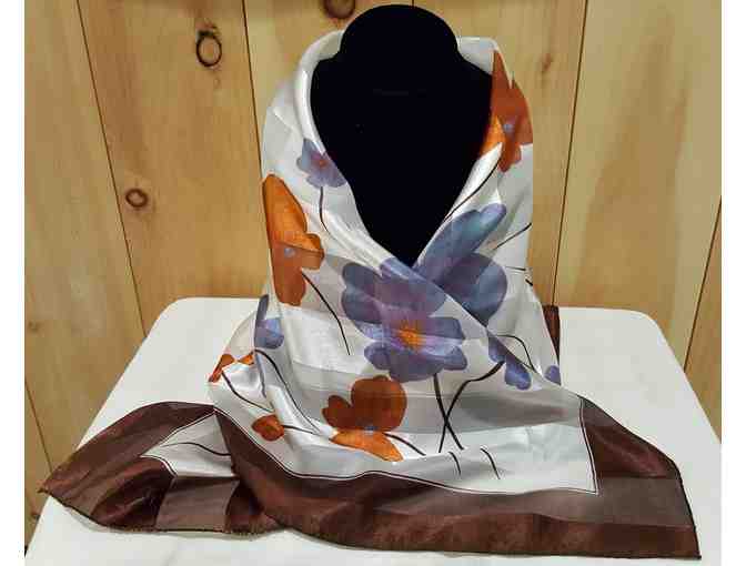 Bold, shimmery silk scarf has a 60's or 70's pop art feel. Orange and blue flowers are bright against the subtle striped background.