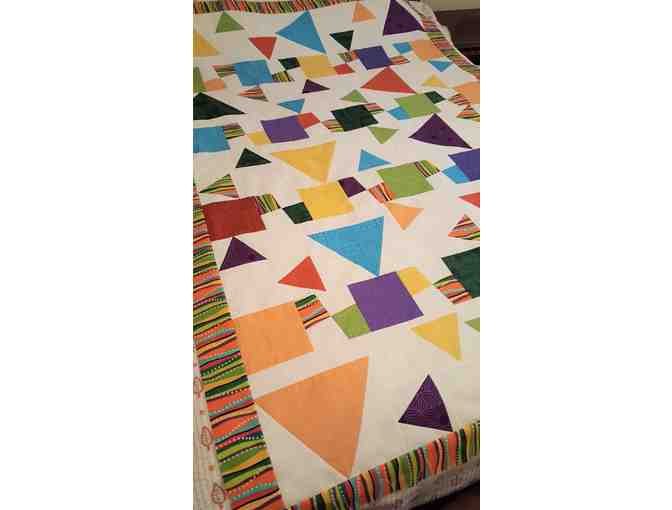 This handmade fun colorful quilt is 54" x 74", all cotton materials and machine washable. Creating a quilt with an odd assortment of angles is no easy feat! This is the perfect gift to brighten up a room! These were created by Jill's Sister-in-law Karen just for you!