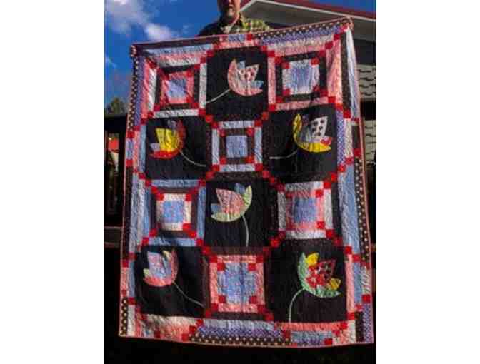 A wonderful accent to a full or queen size bed. Can also display as a wall hanging (a sleeve is stitched on the back for easy hanging on a wall). This handmade quilt is 66"x56". It is machine pieced, hand appliquéd, and machine quilted with a hand stitched binding.