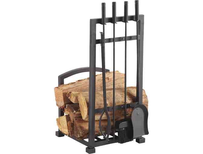 Keep fire logs and tools neatly organized with this combination log holder and fireplace tool set. It features a sturdy base with an arched detailed design to beautifully accent your fireplace and keep tools handy when you need them. Constructed from heavy-duty steel, this log holder and toolset includes a shovel, poker, tongs and brush for all your fire tending needs. This toolset has a black finish that adds both beauty and a classic design. Minimal assembly is needed.