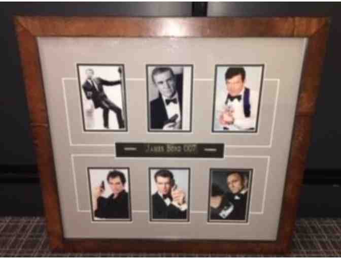 James Bond photo collage - 6 unsigned photos - George Lazenby, Sean Connery, Roger Moore, Timothy Dalton, Pierce Brosnan and Daniel Craig - framed with 2 bullets.