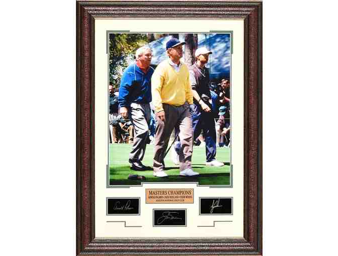 Masters Champions oversize 16"x20" color photo with Palmer, Nicklaus, Woods laser plated signatures and a plaque - framed - 1996 Masters - only time the three golfers were together.