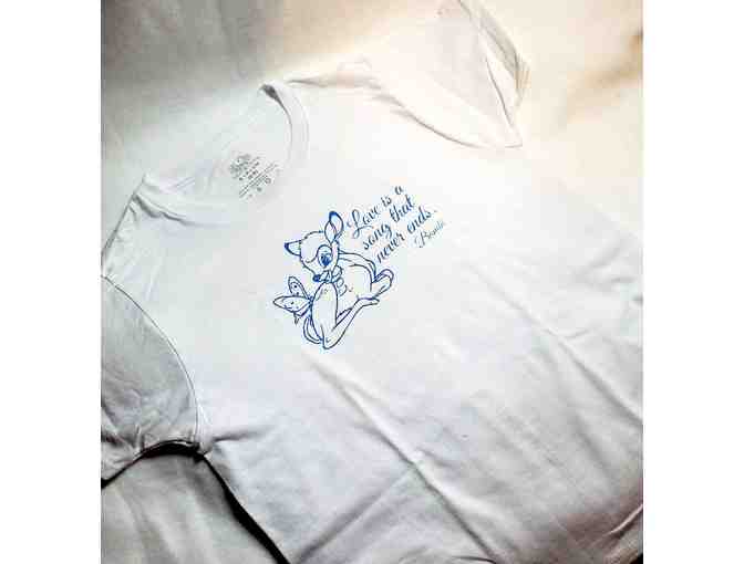 âÂLove is a song that never endsâ Your little one will look adorable in this Bambi inspired shirt. Childs size small (6-8 yrs). Handcrafted by a volunteer for CARA (crafters & artisans for rescued animals). This group of talented people assist all types of animal rescues with crafted items tailored directly to their needs.