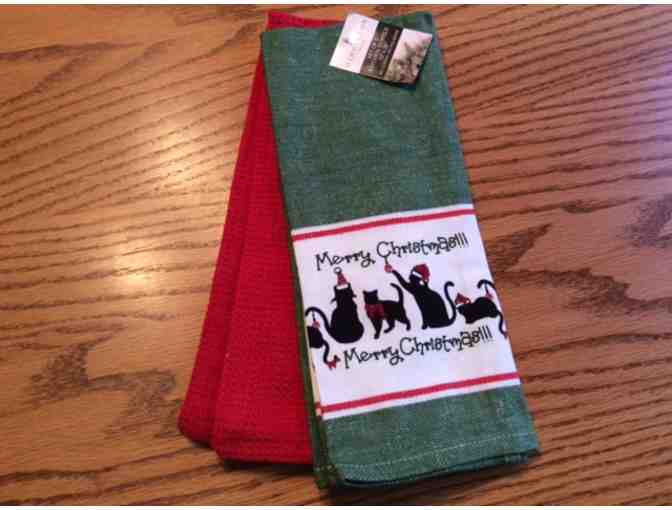 A purrfect addition to your Christmas party. Includes on cat themed flat weaved and one solid red waffle weave towel.