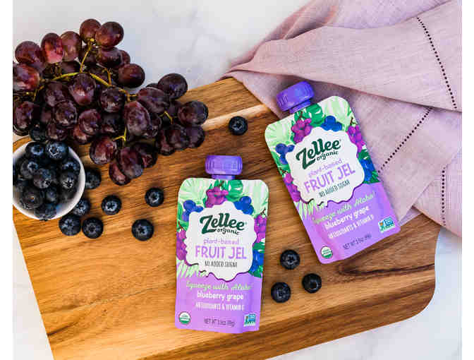 Assorted flavors of Zellee Organic's plant-based fruit jel snacks. 3 cases (36 pouches total) of blueberry grape, orange peach, and strawberry pear flavors.