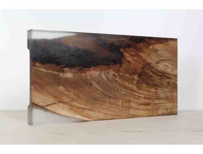 This is a hand crafted charcuterie/cutting board thats made from pecan with a transparent smoky gray epoxy resin cast edge. With carved out grab handles on each end of the board, it insures you have a great grip while carrying to the serving area. It is finished and protected with an all natural oil that is free of any solvents and chemicals and is 100% food safe.