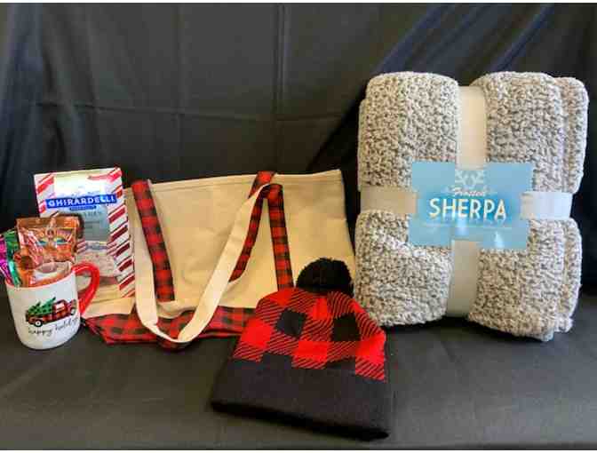 Cozy Buffalo Plaid Gift Package Winter Hat, Tote Bag, Fleece Blanket, Mug, and Hot Cocoa