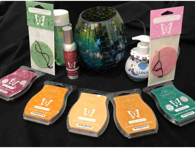 Scentsy Basket filled with seasonal favorites cinnamon: Mosaic Mist warmer, Pumpkin Cinnamon Swirl Scentsy Bar, Walnut Raisin Muffin Scentsy Bar, Cozy Cookie Scentsy Bar, Aloe Vera and Ivy Scentsy Bar, Mandarin Grapefruit Amber Scentsy Bar, Jeweled Pomegranate Room Spray, Luna Hand Soap and Aloe Water, Cucumber Body Wash, Cloudberry Dreams Scent Circle and Grapefruit Scent Circle.