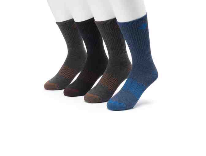 Mid weight crew socks in colors of heathered black, brown, navy and khaki. Shoe size 6-12.