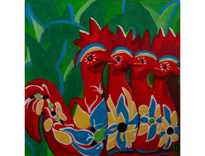 There is no more fun image than that of a series of roosters, all lined up, in the brightest colors possible and with their surprise-filled expressions!