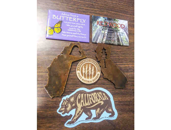 3. two state of California magnets, one with a heart cut out, the other with a redwood tree cut out.