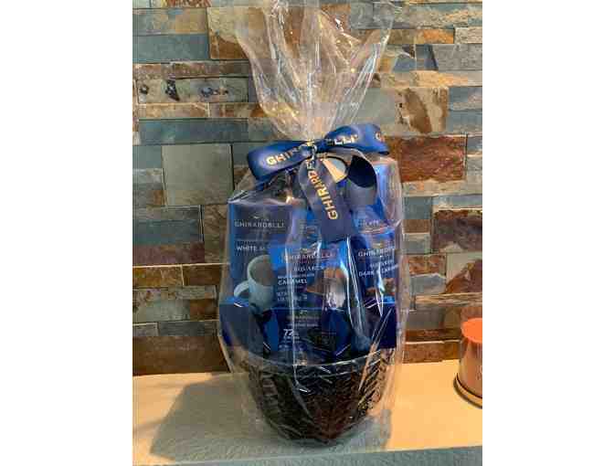 FILLED WITH VARIOUS DARK & MILK CHOCOLATES, CHOCOLATE CHIP COOKIES, DARK CARAMEL SQUARES, WHITE MOCHA HOT CHOCOLATE, DOUBLE CHOCOLATE COCOA IN A REUSABLE PLASTIC BOWL