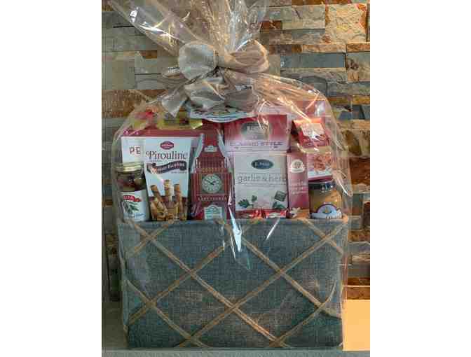 POPPY & SESAME CRACKERS, HAMMOND'S PEANUT BRITTLE, BISTRO STYLE OLIVE, CHOCOLATE HAZELNUT CREME-FILLED WAFERS, ENGLISH TEA, GHIRARDELLI CHOCOLATES, GARLIE & HERB SEASON DIP MIX, PRETZEL STICKS, VANILLA SEA SALT CARAMELS, HONEY MUSTARD, ICED ALMONETTE COOKIES, HOT HONEY CRUNCH SNACKS, IN A FABRIC REUSABLE BASKET
