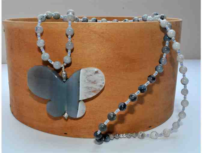 This necklace represents Transformation. The butterfly pendant is hand carved and polished agate in green, gray and white translucent color. The matching 5.5 mm agate beads are of the same colors, strung from the darker shade to white. There is no clasp as it slips easily over the head. Sterling bead accents. Made with multi-strand Softflex beading wire.