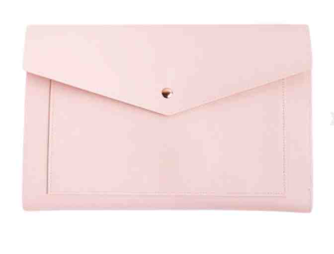 The Megan is 13” wide by 9” tall and is made to fit notebooks or planners, tablets or small laptops and so much more. Pebbled vegan leather.