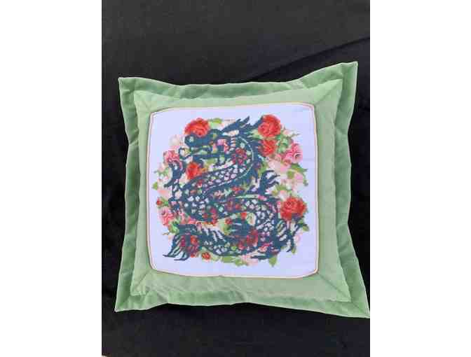 This pillow is one of a kind! Hand stitched by Marilyn Bishop, and generously donated to the Alzheimer's Alliance. The pillow features a cross stitched dragon.
