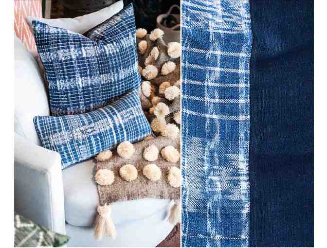 Backed in vintage dark indigo fabric. Package includes one 18 x 18 inch & one 10 x 20 inch pillow.